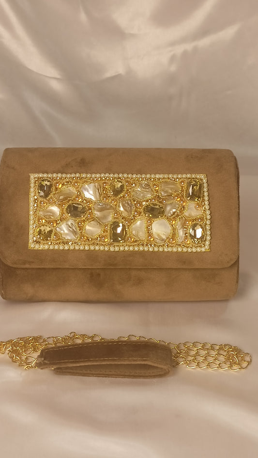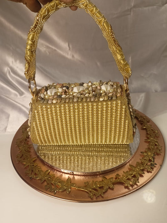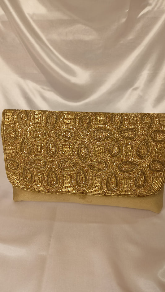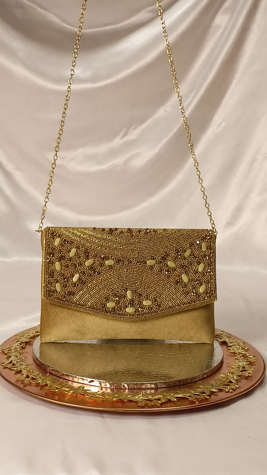 BEAD PEARL WORK GOLDEN FLAP CLUTCH